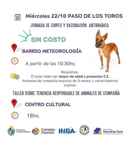 Como anunciamos días atrás, el miércoles 22 de octubre a las 18:00 hrs. en el Centro Cultural de Paso de los Toros un equipo del Instituto de Bienestar Animal (Inba) realizará una charla gratuita dirigida a la población isabelina sobre tenencia responsable, maltrato animal, mordeduras y todo lo relacionado con este ámbito; la intención es informar a la comunidad y evacuar todas las dudas que se tengan al respecto.