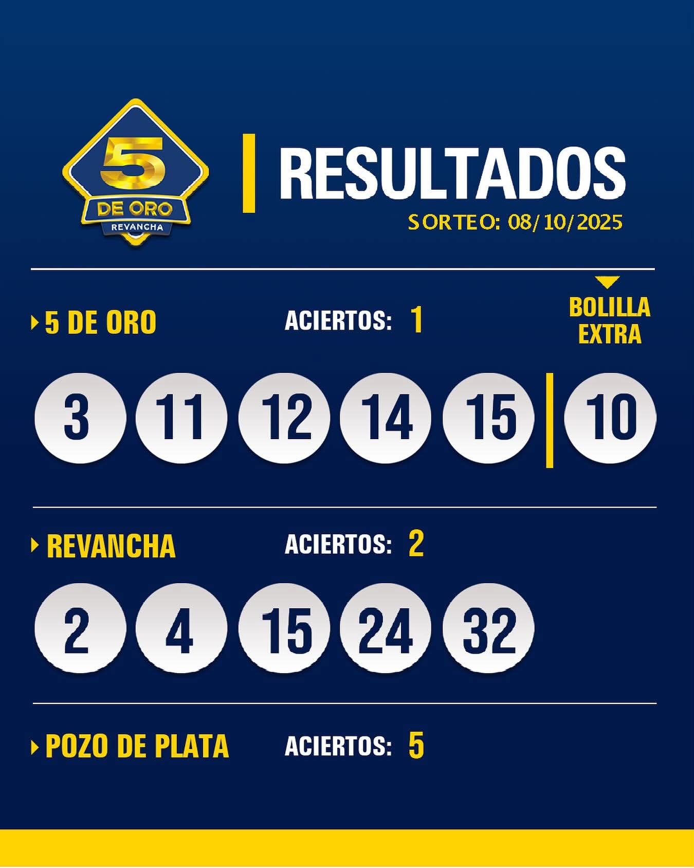 Les compartimos los resultados del sorteo del 5 de Oro con Revancha del día 8 de octubre octubre 9, 2025 Les compartimos los resultados del sorteo del 5 de Oro con Revancha del día 8 de octubre de 2025. Fuente: La Banca Oficial Últimas Noticias Municipio: Dirección de Servicio Social en Acción Cash abrió llamado para vendedor/a de productos financieros y servicios en Paso de los Toros Luis irigoin informó sobre la creación de nuevas oficinas para atención y capacitación a funcionarios municipales Salud Mental: MSP y ASSE lanzan política de acción nacional y presentaron encuesta sobre percepción ciudadana Policía de Tacuarembó: La Justicia decretó la condena de 22 meses de prisión a un hombre de 33 años por varios delitos Se anunciaron los festejos por los 204 años de Durazno De vuelta al Servicio: Municipio realiza el mantenimiento de contenedores de la ciudad UPM: Llamado a Empresas interesadas en brindar servicios de mantenimiento de Alambrados en todo el país El Director Nacional de Discapacidad Federico Lezama se reunió con el intendente Wilson Ezquerra para avanzar en Plan Nacional de Accesibilidad Amistoso: Uruguay fue efectivo y derrotó 1-0 a República Dominicana en Kuala Lumpur Comisión del Club 25 organiza gran Cena Show el 8 de noviembre para sus socios y población en general UTE lanza nuevamente la tarifa básica con 40% de descuento: a quiénes beneficiará Noticias Relacionadas Comisión del Club 25 organiza gran Cena Show el 8 de noviembre para sus socios y población en general Descubre cuáles son sus predicciones para cada signo zodiacal para este viernes 10 de octubre AFE: A partir de mañana, vuelve la programación y operación normal de los servicios de pasajeros Tacuarembó – Rivera Descubre tu HORÓSCOPO DE HOY: qué te deparan los astros este 9 de octubre Jinetes de Tacuarembó participan en la marcha por el Bicentenario de las batallas de Rincón y Sarandí Descubre tu HORÓSCOPO DE HOY: qué te deparan los astros este 8 de octubre Convocatoria al programa «Yo estudio y trabajo» Te compartimos el mensaje de los astros para tu signo en el Horóscopo del 7 de octubre Te compartimos el mensaje de los astros para tu signo en el Horóscopo del 6 de octubre Les compartimos los resultados del sorteo del 5 de Oro con Revancha del día 5 de octubre Te compartimos el mensaje de los astros para tu signo en el Horóscopo del 5 de octubre Ve qué farmacia está de turno esta semana y sus números de contacto en la Guía Online