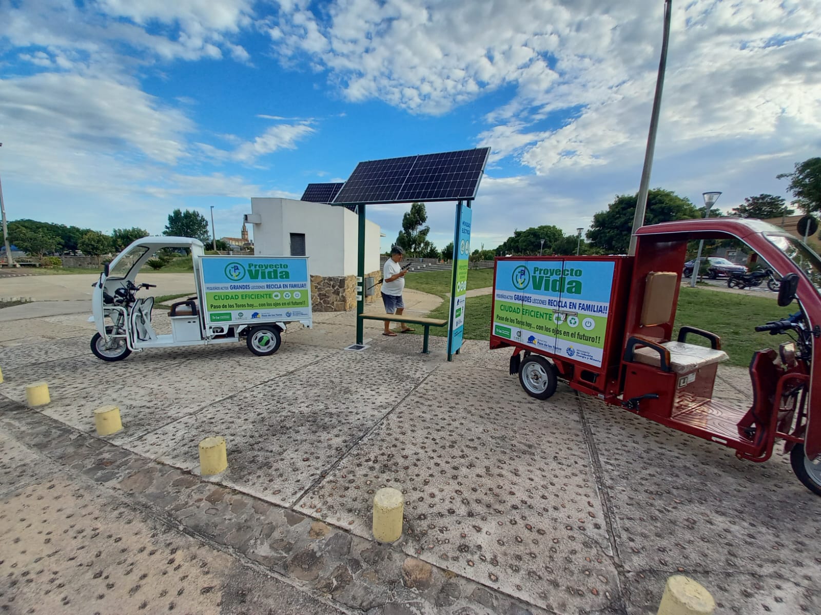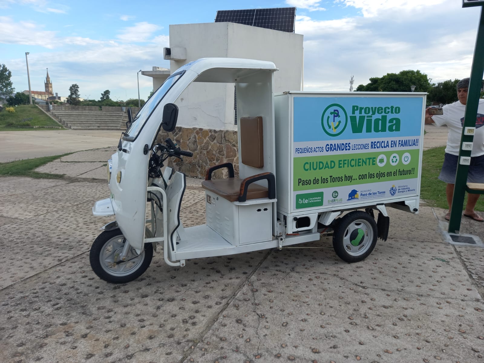 Con la visita del Director Nacional de Energía (DNE), Christian Nieves, se cristalizó la pasada jornada la entrega de dos triciclos eléctricos y la puesta en servicio de una estación de carga solar, para fortalecer la labor del Proyecto Vida en lo que respecta a recolección, acopio y clasificación de material de reciclaje en todo la ciudad. La inversión en este proyecto alcanzó la cifra de un millón 21 mil 343 pesos uruguayos, los cuales fueron financiados 70% por la DNE (cerca de 700 mil pesos) y 30% el Municipio local.