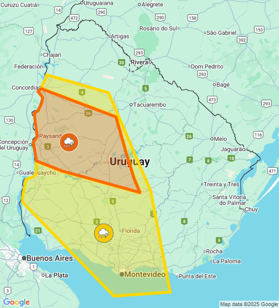 Descripción: Frente frío afecta el país, generando tormentas algunas puntualmente fuertes. Cabe destacar que en zonas de tormentas se podrán registrar lluvias abundantes en cortos períodos, ocasional caída de granizo, intensa actividad eléctrica y rachas de vientos fuertes. Se continuará monitoreando la situación y se informará ante eventuales cambios.